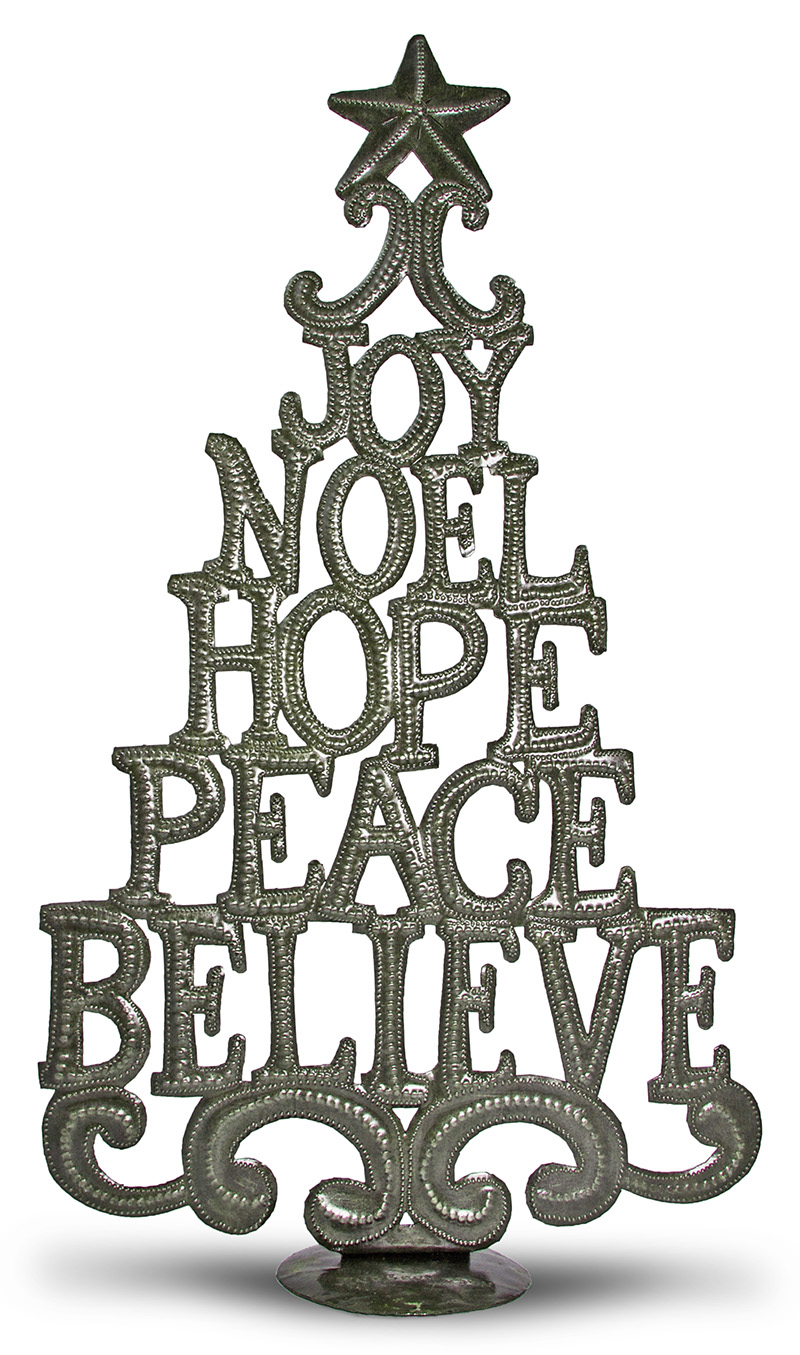 All of you favorite holiday words are stacked up to make a great table-top tree with base. Crafted by Jean Joseph Son.