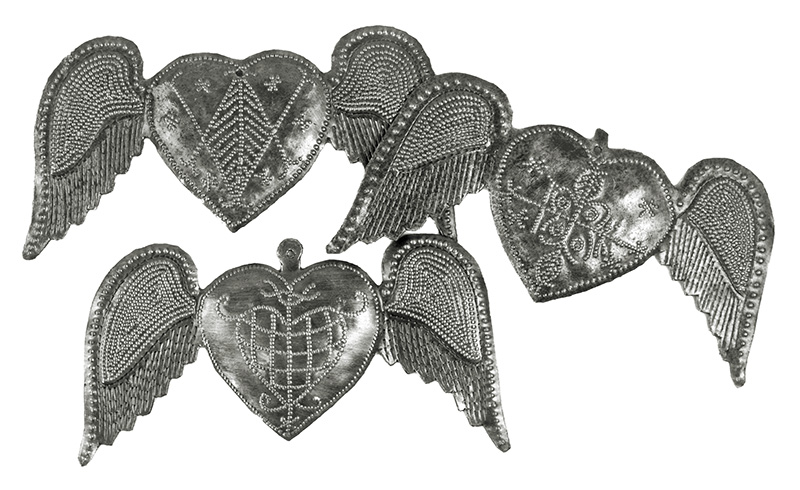 There is something magical and fun about these winged hearts. The decorating on these pieces is intriguing. Sold as an assorted set of three. Created by Brutus Wiseton.