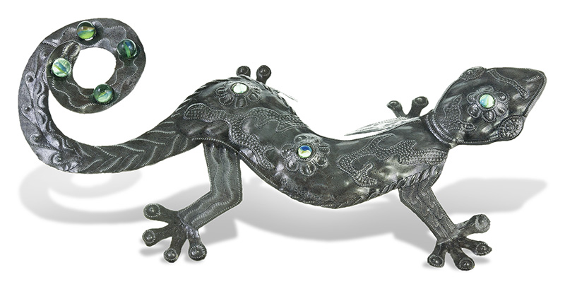Our newest 3-D gecko comes alive with embedded colored glass marbles. Made by Robento Dorestan.