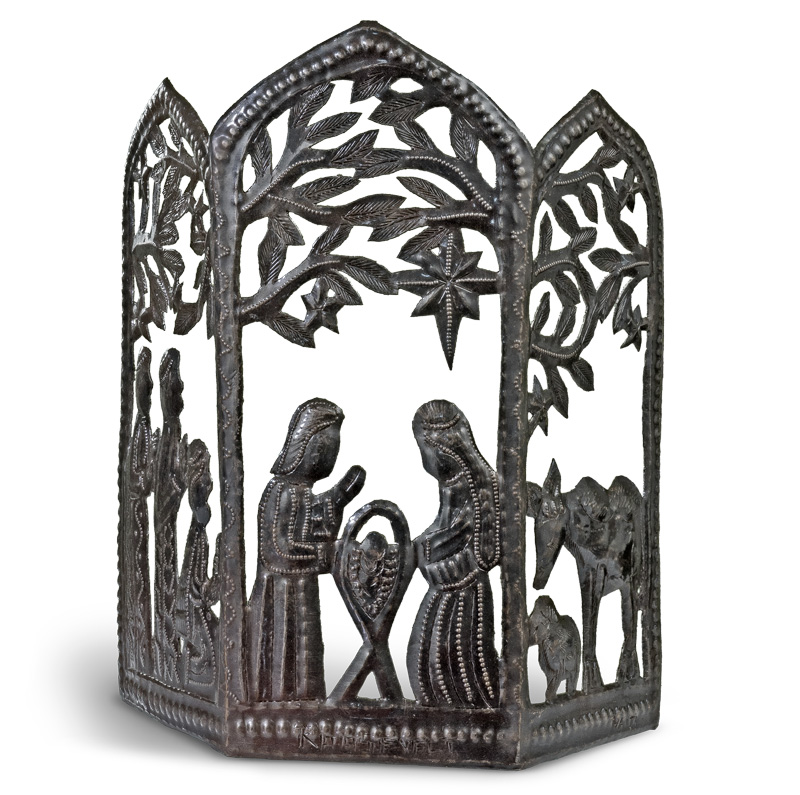 Our new nativity candle screen features wonderful gothic arches and star-filled trees … just waiting for candle light to make it glow. Made by Roosevelt Beauchard.