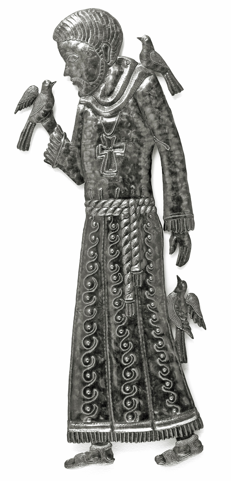This sculpture of St. Francis of Assisi is an impressive size and captures a reflective moment with nature. Created by Nicolson Mathieu.