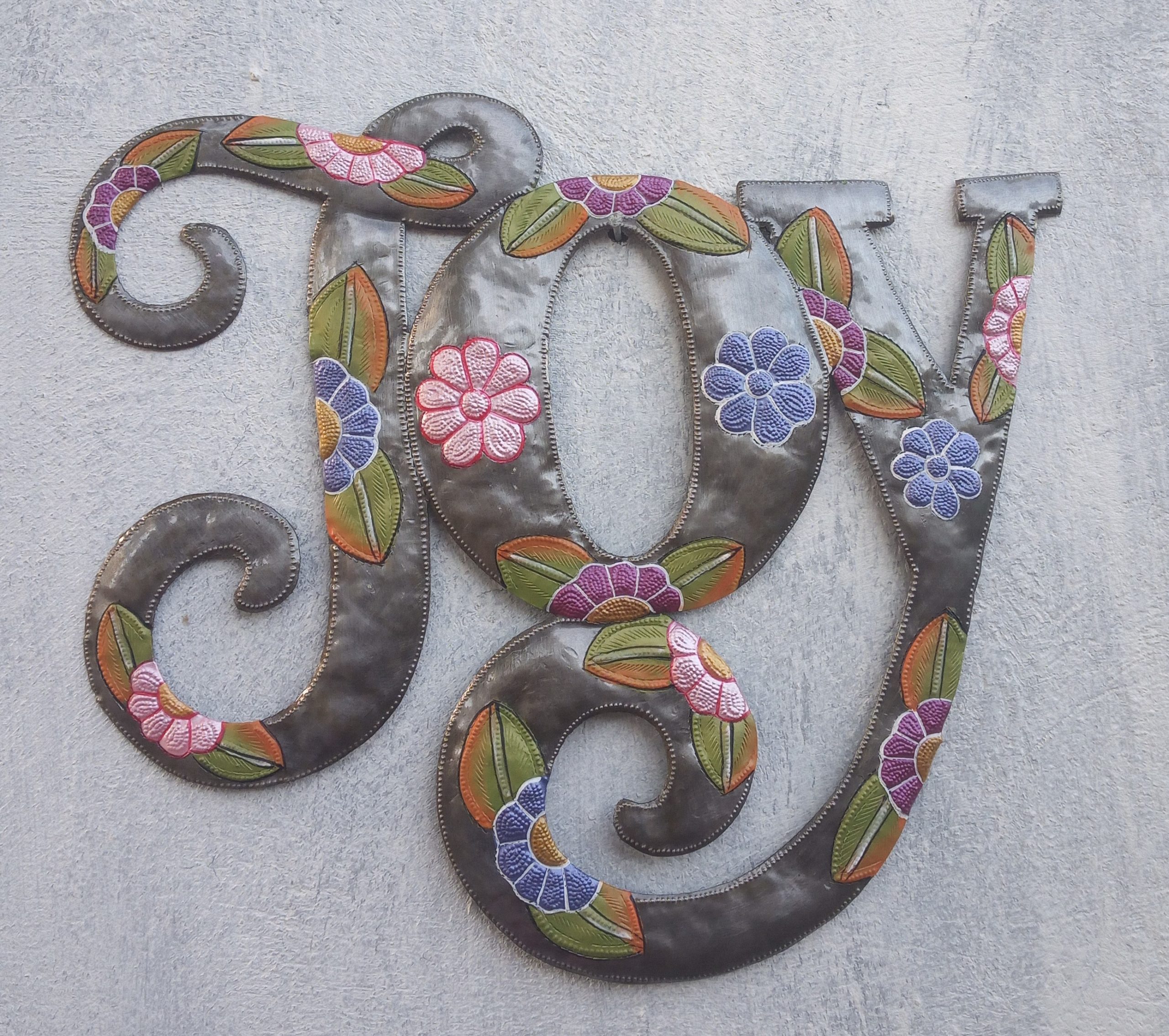 17″ x 14″ Here’s a new painted design that is headed quickly for best-seller status. Hand scultpted and painted flowers take JOY to a whole new level! Crafted by Paul Kensley. Handmade from recycled oil barrels. Completely varnished and ready for indoor and outdoor display.