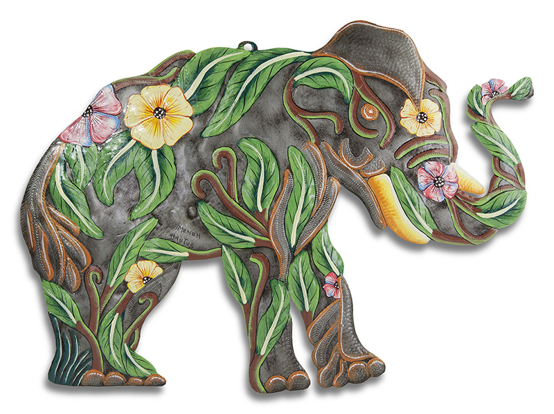 The elephant metal wall sculpture is the perfect canvas for this floral decorative hand painting … just beautiful! Made by Yvemer Brutus.