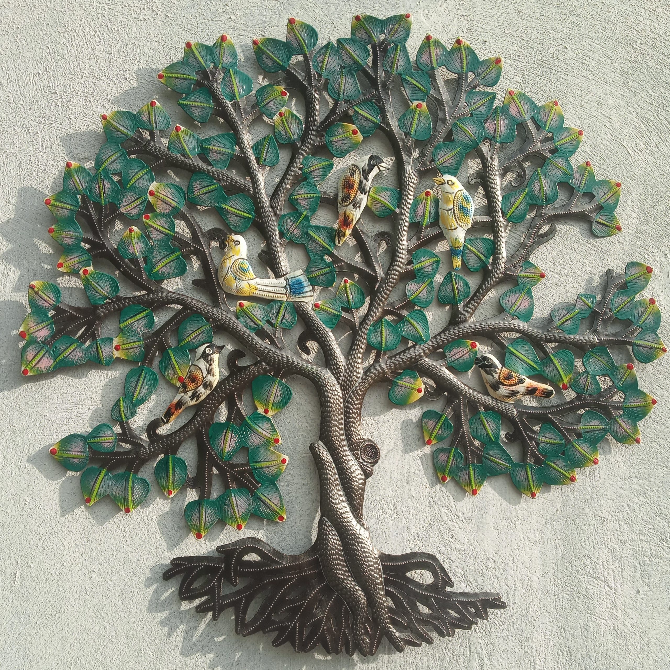 23″ x 23″ Unique and intriguing, this new painted tree of life highlights yellow and green hues, while leaving some of the patinaed metal exposed. These five yellow birds have found a happy home! Designed and crafted by Johnkerry Brutus in Haiti. Handmade from recycled oil barrels. Completely varnished and ready for inddor and outdoor display.